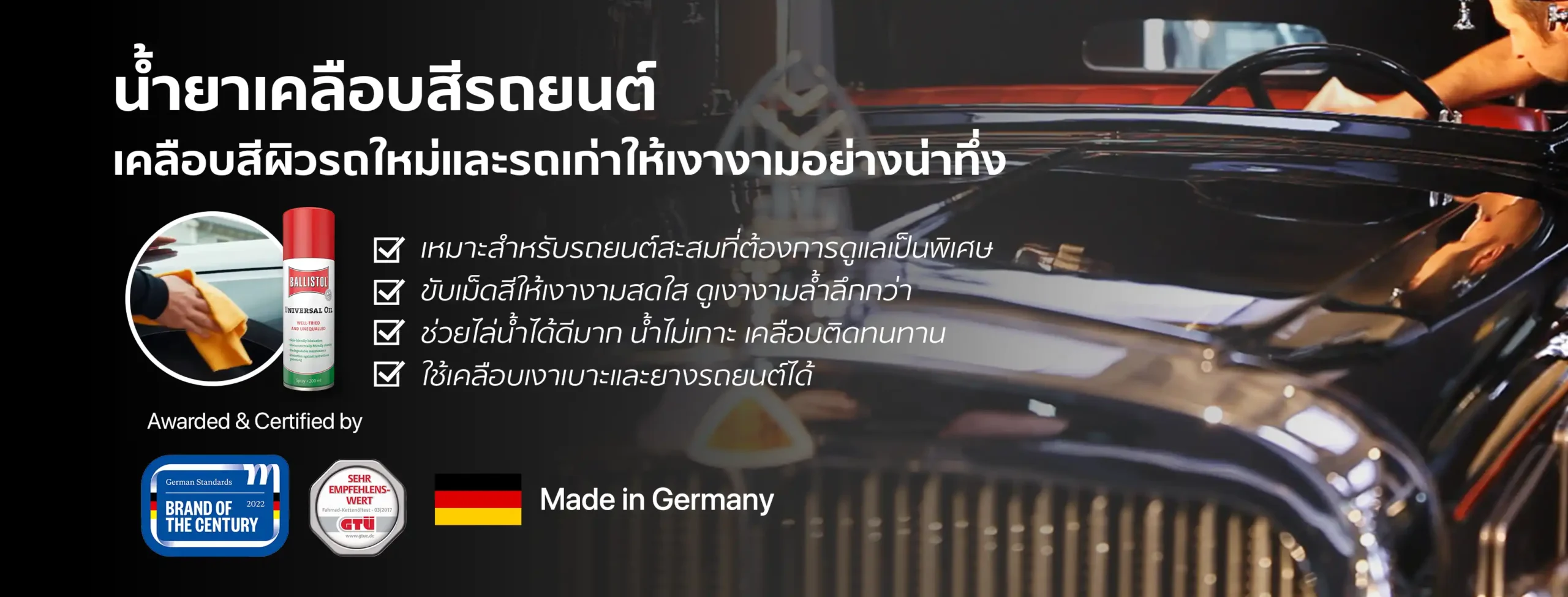 Ballistol น้ำยาเคลือบสีรถระดับมืออาชีพที่นิยมกันอย่างแพร่หลายในแวดวงยานยนต์จากประเทศเยอรมันนี ให้ความเงางามล้ำลึกกว่า ช่วยขับเม็ดสีให้เงางามสดใส เคลือบติดคงทนยาวนาน เสมือนเป็นน้ำยาเคลือบแก้วที่ท่านสามารถทำเองได้ที่บ้านได้อย่างง่ายดาย ใช้งานง่าย เพียงฉีดแล้วเช็ด เรียบลื่น เบาแรง ช่วยกลบรอยขนแมว ให้ผิวรถของคุณสวยสดเงางามสมบูรณ์แบบ