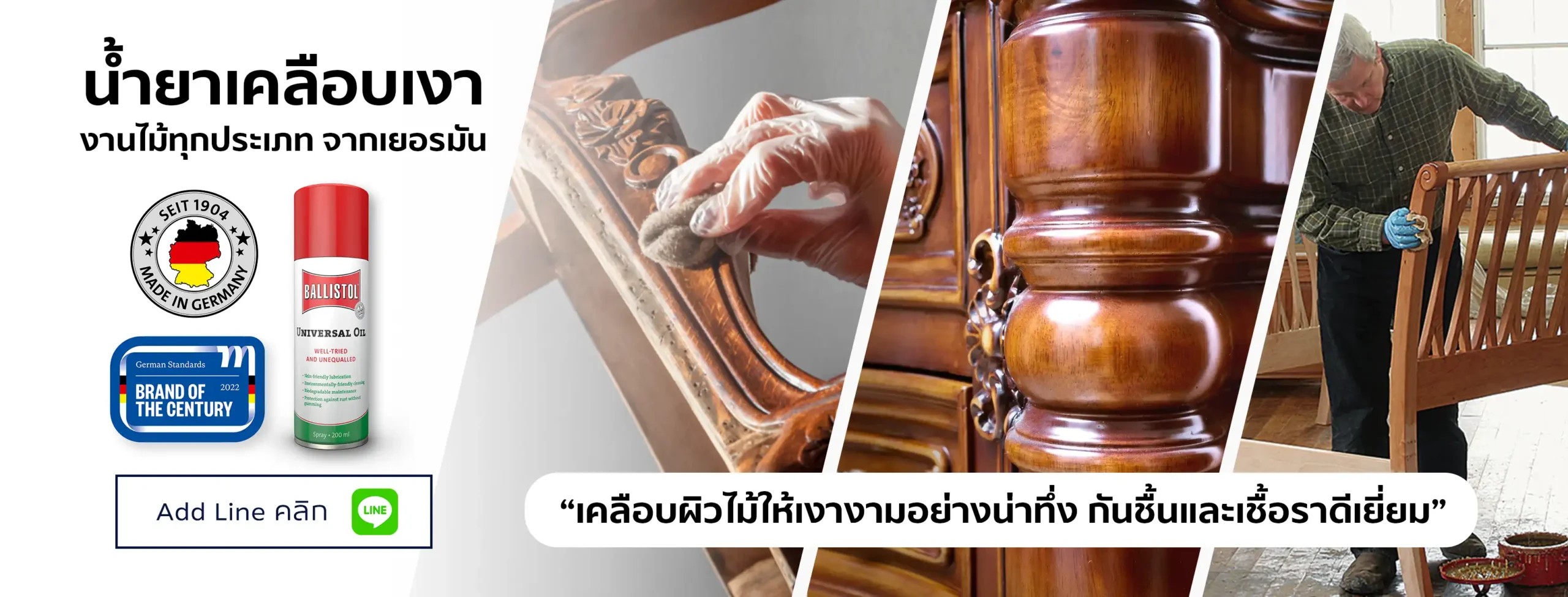 น้ำยาเคลือบผิวไม้ Ballistol (บอลลิสตอล) จากประเทศเยอรมันนี เป็นน้ำยาเคลือบเงาไม้คุณภาพสูง ช่วยฟื้นฟูงานไม้ที่เคยดูหม่นหมอง ให้กลับมาเงางามอย่างเป็นธรรมชาติ สีสดชัดเหมือนใหม่ ดูมีชีวิตชีวา ช่วยขับลายไม้ให้เด่นชัดขึ้น กันน้ำได้ดีเยี่ยม ช่วยปกป้องไม้จากความเสียหายจากความชื้น เชื้อราและแมลง ช่วยเพิ่มมูลค่าให้กับสินค้าเครื่องหนัง หรือภาพลักษณานไม้ที่คุณรักได้เป็นอย่างดี อยากรู้ความเป็นมา คลิก >>